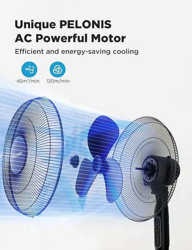 - NEW VERSION: Upgraded Pelonis pedestal fan is equipped with a more powerful motor and high-quality blades, it makes cooling more efficient and energy-saving. This standing fan with 3 speed settings and 7-hour timer with Auto Shut-off for wide area cooling in medium to large rooms. It generates strong airflow to boost the cooling effect while operating at a low noise level in any room in your home.